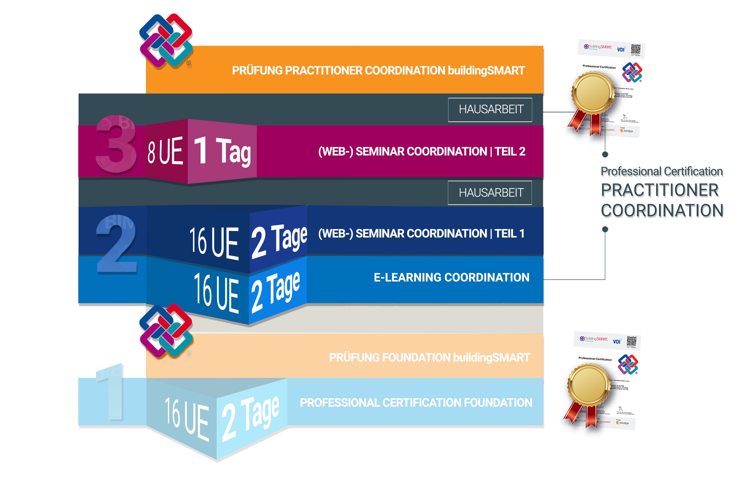 Would you like to be certified as a practitioner by buildingSMART? We will be happy to register you as eligible to take the exam with buildingSMART after you have completed all learning units (e-learning and practical seminars) and have a BIM basic certificate (Professional Certification Foundation).
