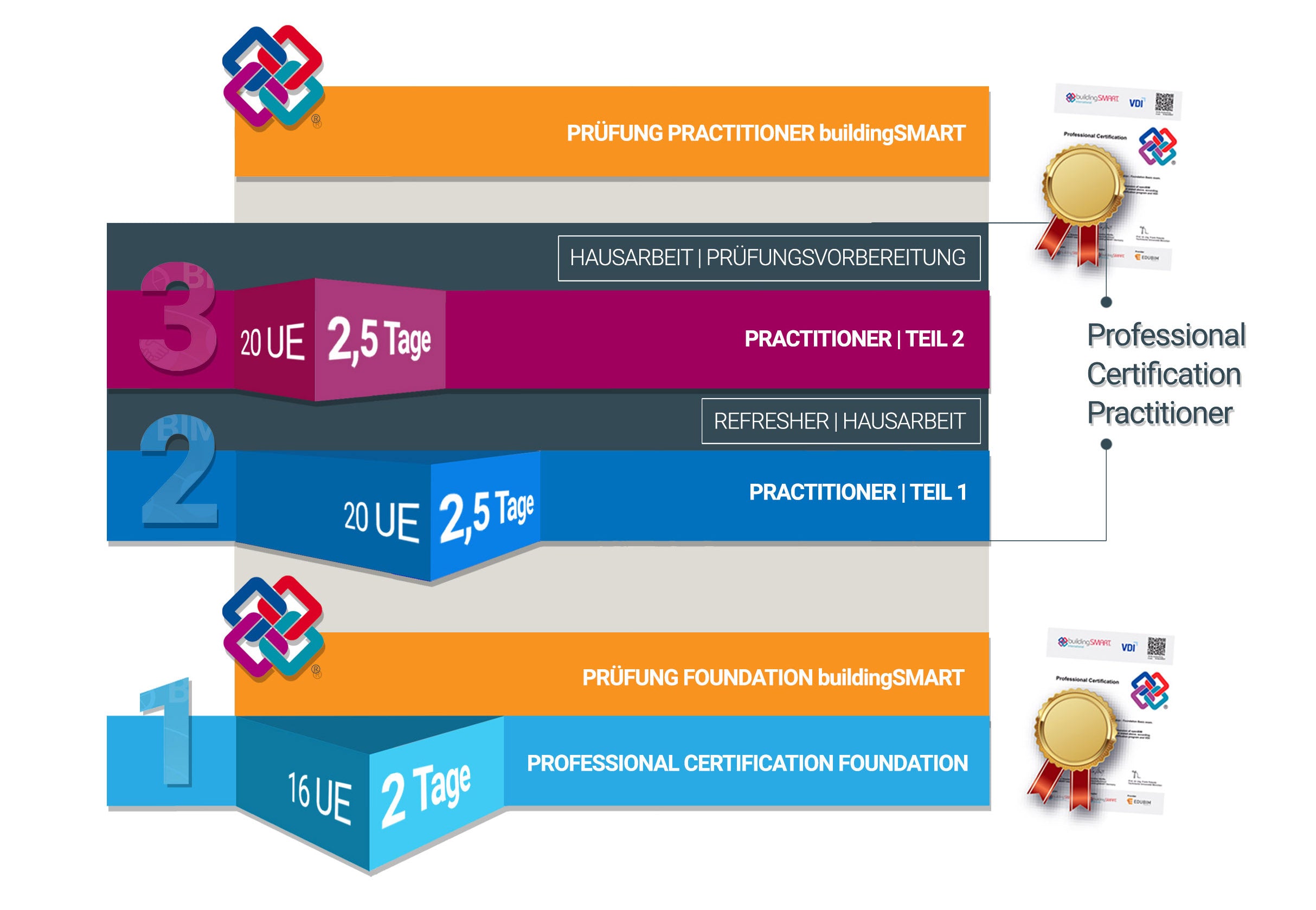 Ein kurzer Überblick über Aufbau und Dauer Ihrer Professional Practitioner Ausbildung im Bereich des BIM Managements mit optionalem buildingSMART Zertifikat